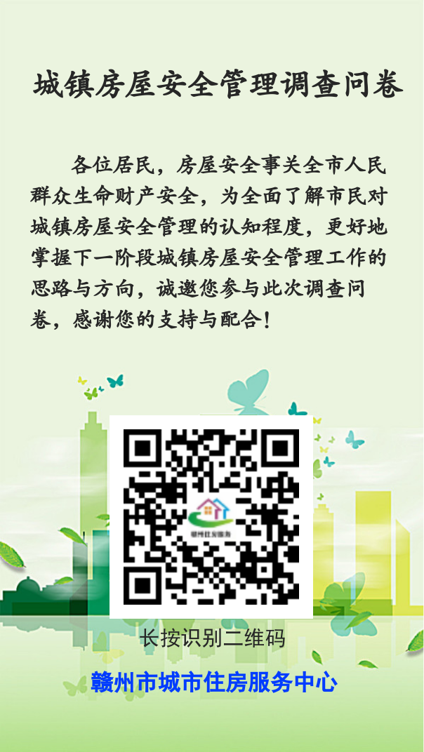 各位居民,房屋安全事关全市人民群众生命财产安全,我市一直以来高度重视城镇房屋安全管理工作。为全面了解市民对城镇房屋安全管理的认知程度,更好地掌握下一阶段城镇房屋安全管理工作的思路与方向,诚邀您参与此次调查问卷,感谢您的支持与配合。