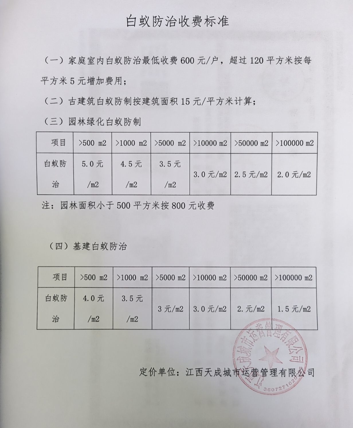 江西天成城市运营管理有限公司白蚁防治收费标准