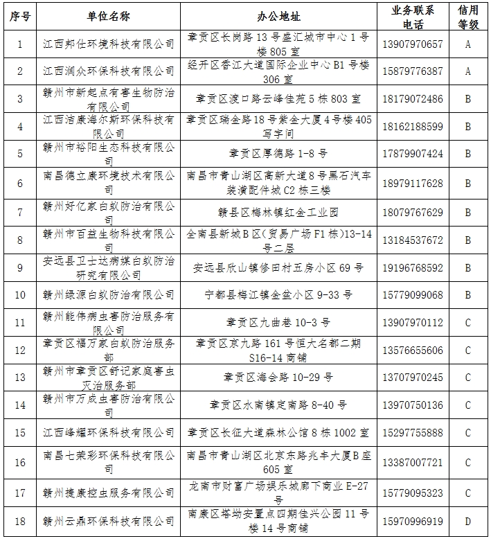 根据《赣州市房屋白蚁防治单位名录信用管理办法(试行)》《赣州市房屋白蚁防治单位信用评分指标》相关规定,我中心开展了2023年度赣州市房屋白蚁防治单位信用等级评定工作。经入库白蚁防治单位自主申报、我中心核查、拟定信用等级、公示等程序,现将评定结果公告如下: