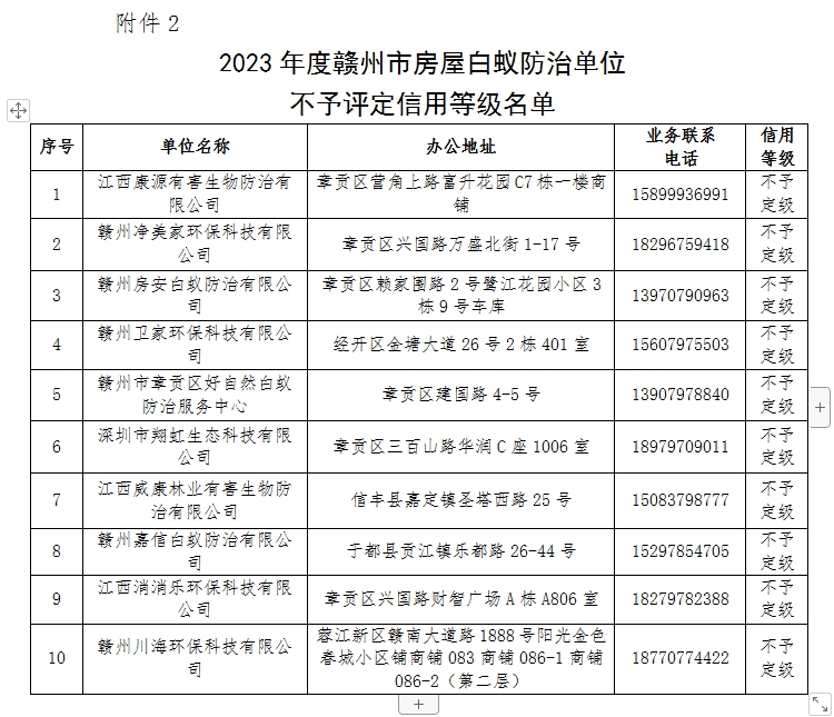 2、2023年度白蚁防治单位名录库中,江西康源有害生物防治有限公司等10家入库白蚁防治单位,因未按要求申报信用信息资料,决定不予确定其信用等级,具体名单见附件2。